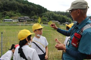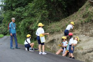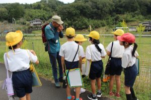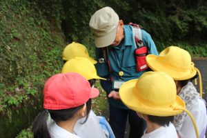 総合的な学習の時間で、6月に岐阜県環境教育推進委員の伊藤さんと日吉の川について調べた5年生が、今回は日吉の山と里について調べるために、3時間かけて学校周りの山や自然の散策をしました。子どもたちは伊藤さんの説明を聞きながら、普段は見過ごしている日吉の自然について新しい発見をすることができました。今後5年生は、間伐体験を行い、日吉の環境についてまとめていきます。