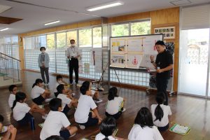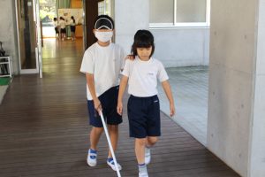 4年生が総合的な学習の時間「福祉学習」の一環で「白杖体験」をしました。社会福祉協議会の方を講師に、盲目、弱視の方の大変さと、支え方について学びました。「肩や肘に手をおいて歩くと安心できる」「『階段がある』などの情報を言ってもらうと歩きやすい」などを実際に体験しました。4年生はこれまで点字体験、高齢者疑似体験、車いす体験と学んできました。2月14日の参観日にその学びのまとめを発表します。