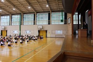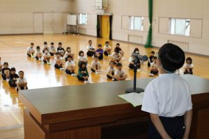 前期終業式から4日、14日に後期始業式を行いました。校長からは後期の目標を具体的にもつことと、後期の宝物を作っていくために、自分や仲間を大切にしていくことと、勉強を頑張ることについて話しました。児童代表の話は1年生と4年生でした。代表児童は堂々と自分の目標を話してくれました。後期がスタートしました。たくさんの宝物をつくれる6ヶ月になることを期待しています。