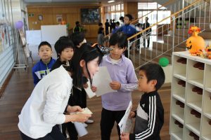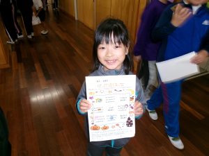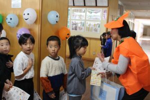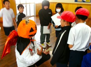 今年もハロウインイベントを行いました。休み時間にハロウィングッズを付けた先生に自分から英語で会話ができるとシールが貰えます。9つの枠があるビンゴカードにシールが縦横斜めに3つ貼れたらお菓子(金平糖)がもらえるとあって、どの学年の子どもたちも積極的に先生と英語で会話をしていました。「How are you?」「What color do you like?」など、子供たちとの楽しい会話にパンプキンマンも大忙しでした。