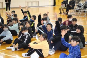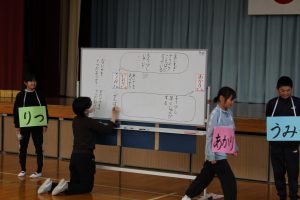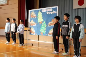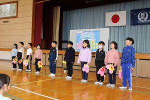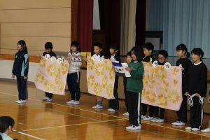 3日の5時間目にひとりだち委員会主催の「ぽかぽか集会」を行いました。授業参観を兼ね、保護者、コミュニティ・スクールの方、日吉町民生委員会の方、日吉町福祉委員長を招待して開催しました。よりよい人間関係をつくっていくための言葉遣い、気の配り方などを学年で発表したり、全校で考えたりした素敵な集会となりました。最後にのぼり旗にするあいさつ標語12作品を表彰しました。