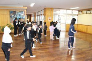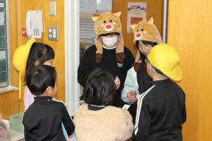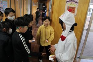 ひとりだち委員会企画の「クリスマスあいさつイベント」を22日から24日まで行っています。クリスマスグッズを身に着けた委員がそれぞれ名前呼びあいさつ、先駆けあいさつ、じゃんけんあいさつなどのミッションを担い、上手にあいさつできた子にクリスマスカードを渡しています。10枚集めるとサンタさんから25日にプレゼントが贈られます。朝から元気なあいさつが廊下や教室に行き交っています。25日にどんなプレゼントがもらえるかは誰も知りません。