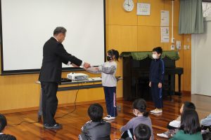 27日から1月7日まで冬休みです。今年最後の授業で「冬休み前集会」を行い、冬休みの生活について心掛けることを確認しました。生徒指導担当教諭から、安全面、健康面、けじめのある生活などについて話しました。お金の使い方、ゲームの時間制限は特にこの冬休みに気を付けたいことです。最後に、絵画ポスターや習字の入賞者9名を紹介し、表彰しました。小学生の皆さん、楽しい冬休みを過ごしてくださいね。