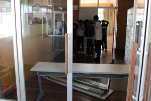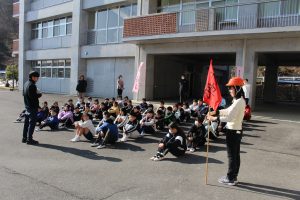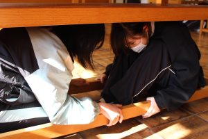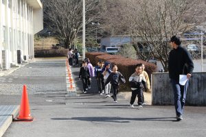 第5回目の命を守る訓練を行いました。今回は特別教室で学習しているときに地震が発生したという設定で行いました。火災ではないので、状況を判断し、安全を確保しながら避難することを重点にしました。避難経路には地震によって通行できなくなった箇所を作りました。子どもたちは担任と安全を確認しながら避難しました。普段の生活でも危機回避能力、危険察知能力を鍛えていくように指導をしていきます。