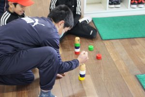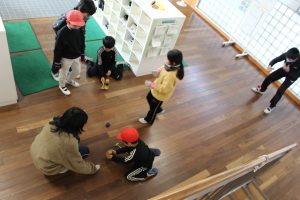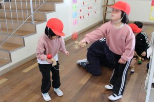 児童玄関に「けん玉」「だるま落とし」「お手玉」を置いて、自由に遊べるようにしています。子どもたちは20分休みや昼休みに、友達と、または一人で少し遊んでから運動場に向かいます。昔の遊び道具は子どもたちの器用さを養うよい教材です。