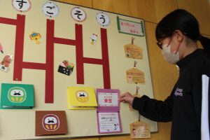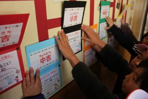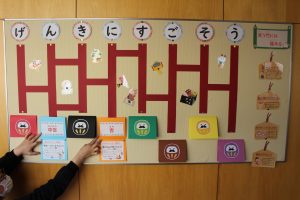 毎月、保健室前の廊下掲示が保健室の先生によって更新されます。1月は「あみだおみくじ」で健康な生活を過ごすためのアドバイスをしています。子どもたちの生活動線にない保健室ですが、時々掲示を見に子どもたちがやってきます。子どもたちに保健室の先生の思いが届き、健康な生活を過ごしてほしいと願います。