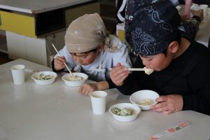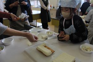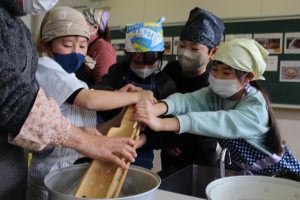 3年生が種から育てた大豆を調理して、豆腐を作りました。子供たちは細久手長寿会の方、JAとうとの方、保護者の方の応援をいただきながら、豆腐作りの手順に沿って楽しく豆腐を作っていました。できた豆腐とおからはみんなで美味しくいただきました。