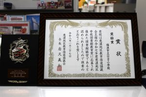 東濃地区学校図書館コンクールにおいて、日吉小学校の図書館が奨励賞を受賞し、27日に賞状と盾が授与されました。魅力的な図書館の雰囲気、子供や先生によるおすすめの本の紹介、必読書の取組状況、図書委員会の活動など、様々なところで高く評価してもらいました。家族読書週間などで保護者の方にもご協力をいただきました。ありがとうございました。今後も子どもたちの心の栄養となり、思考力を高める読書指導を進めていきます。
