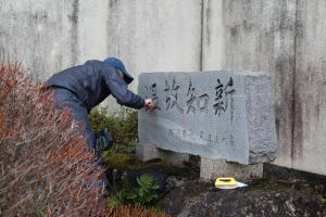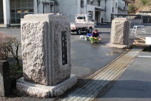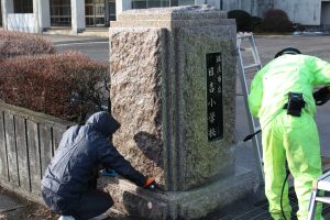 昭和58年に設置された日吉小学校の門柱は42年間の雨風のために黒く汚れてしまっていまいした。日頃から気にかけてくださっていた渡辺石材さんがご厚意で清掃してくださいました。この門柱は日吉の桜御影石で貴重なものだそうです。一緒に「温故知新」の石碑、けやきの表札も清掃していただけました。おかげで子どもたちも気持ちよく登校することができます。ありがとうございました。(1枚目清掃前 3枚目清掃後)