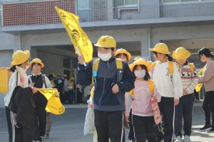 9日の5時間目に分団会を行い、昇降口の前で新しい分団長に旧分団長から分団旗が受け渡されました。1年間分団の仲間の安全に心配りをしてくれた分団長さんは、残りの2週間は最後尾から仲間の安全を守ります。新しい分団長は、これから安全な登校のために頑張ってください。初日の今日は、少し緊張しながらも新分団長を先頭に、しっかりまとまって登校していました。